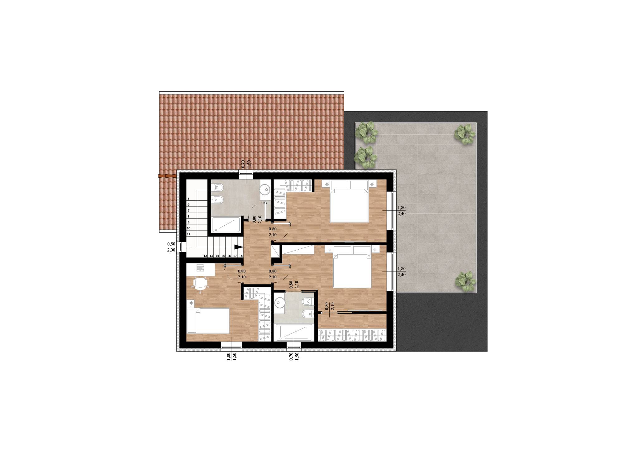 Al piano primo troviamo un disimpegno notte, camera padronale con affaccio e uscita sulla terrazza/ solarium di oltre 30mq e dotata di comodo bagno e di una spaziosa e funzionale cabina armadio, seconda camera matrimoniale, terza camera doppia e ampio bagno.