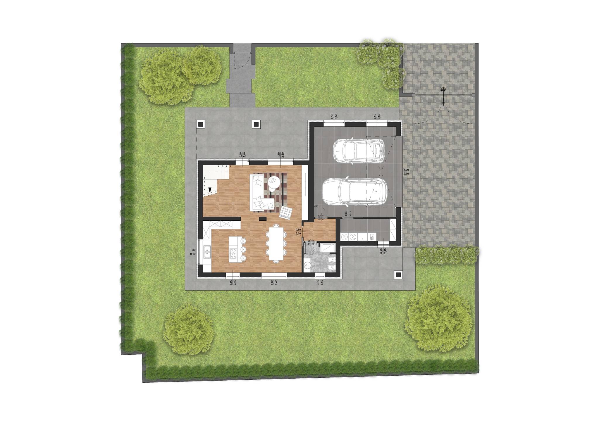 L' immobile è suddiviso su due livelli, al piano terra si accede mediante portico d' ingresso nella spaziosa e luminosa zona giorno con cucina a vista ed ampie porte finestra scorrevoli con affaccio sul giardino privato, disimpegno con bagno e locale lavanderia, box auto doppio in larghezza.